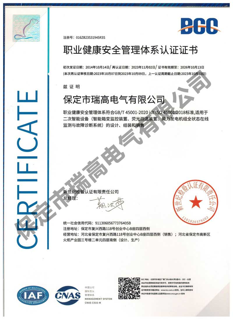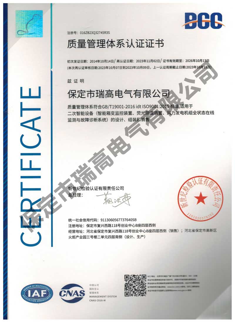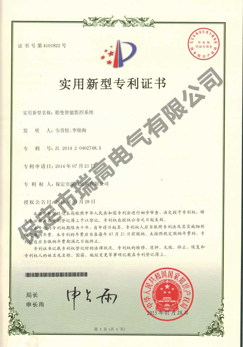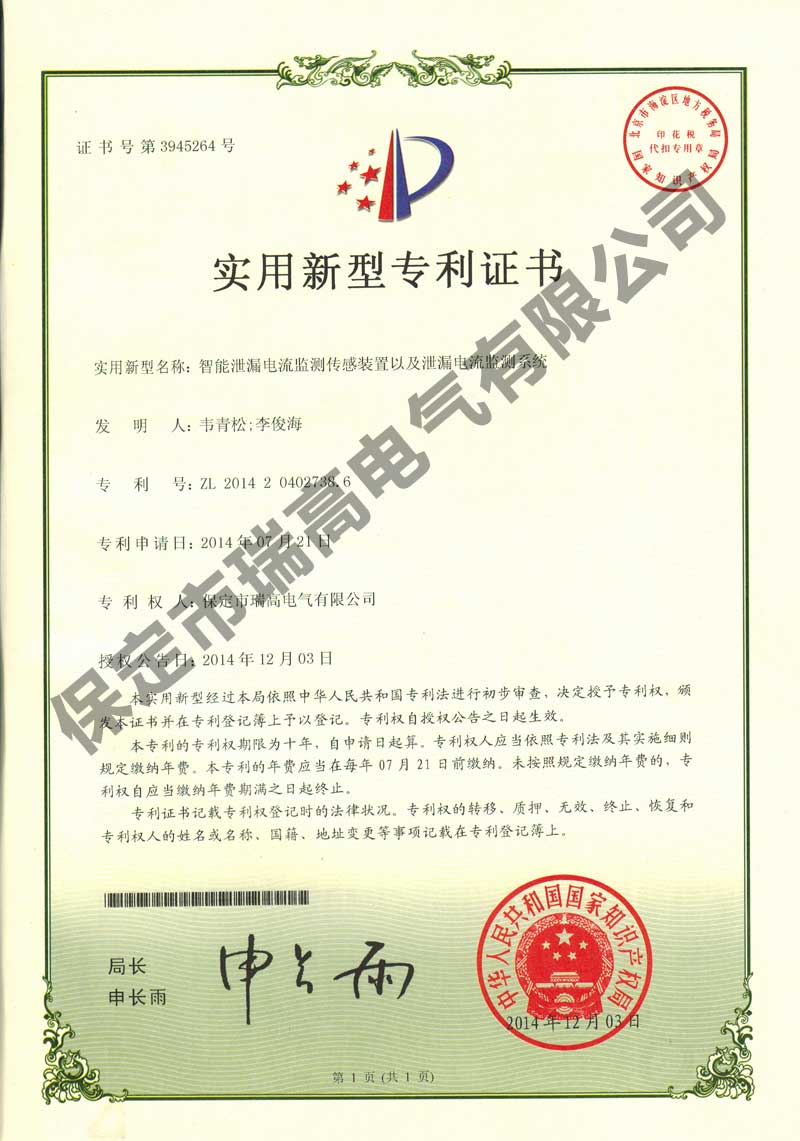 職業(yè)健康安全管理體系認證證書職業(yè)健康安全管理體系認證證書質量體系認證證書質量體系認證證書電池溫度檢測組件電池溫度檢測組件放電間隙放電間隙基于IGBT技術的分支可控智能匯流箱以及光伏系統基于IGBT技術的分支可控智能匯流箱以及光伏系統新型智能型變壓器風冷控制柜實用新型專利證書新型智能型變壓器風冷控制柜實用新型專利證書箱變智能監(jiān)控系統箱變智能監(jiān)控系統智能泄露電流監(jiān)測傳感裝置以及泄露電流監(jiān)測系統智能泄露電流監(jiān)測傳感裝置以及泄露電流監(jiān)測系統